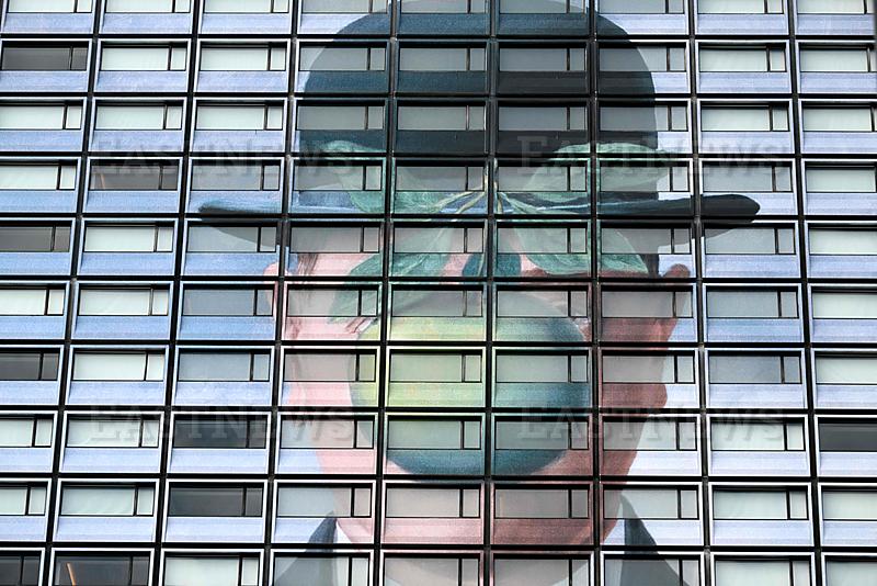 This photograph shows a reproduction of the painting “The Son of Man” by Belgian surrealist painter Rene Magritte on the facade of a hotel in Brussels, on February 4, 2026. (Photo by Nicolas TUCAT / AFP)