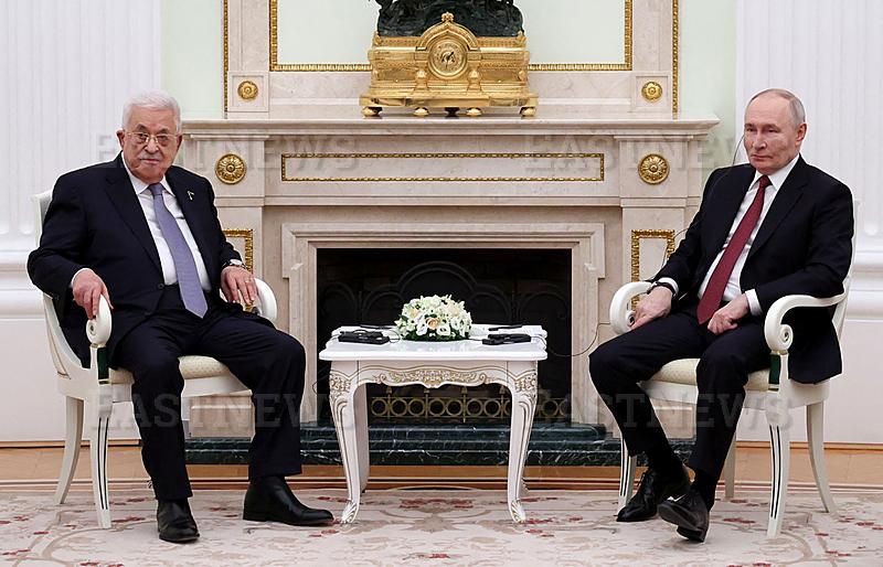 Russian President Vladimir Putin and Palestinian President Mahmoud Abbas hold a meeting at the Kremlin in Moscow on January 22, 2026. (Photo by Ramil Sitdikov / POOL / AFP)