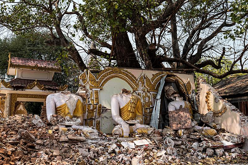Earthquake-damaged Buddha statues are seen at Shwe Ku Gyi Pagoda in Mandalay on March 19, 2026, ahead of the one year anniversary of the 7.7 magnitude quake that struck on March 28, 2025. The magnitude 7.7 magnitude earthquake on March 28, 2025 killed more than 3,700 people as it razed buildings in Myanmar`s central belt, with devastation focused on the second-most-populous city of Mandalay. (Photo by Sai Aung MAIN / AFP)