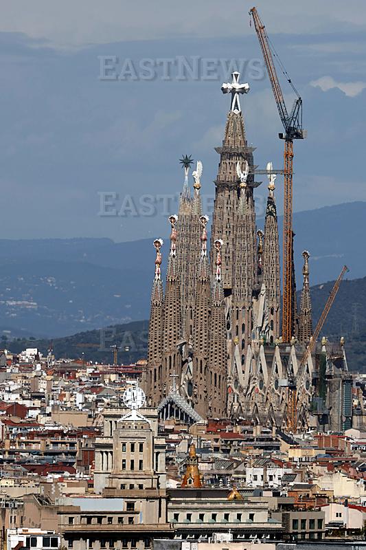 This general view of the Sagrada Familia basilica taken on March 28, 2026 shows the now fully revealed 17-meter-high and 13.5-meter-wide cross that completes the temple`s main Tower of Jesus Christ in Barcelona. The Sagrada Familia basilica`s central tower`s cross crowns the world`s tallest church at 172.5 meters, a temple conceived by Antoni Gaudi more than 140 years ago. (Photo by Lluis GENE / AFP)