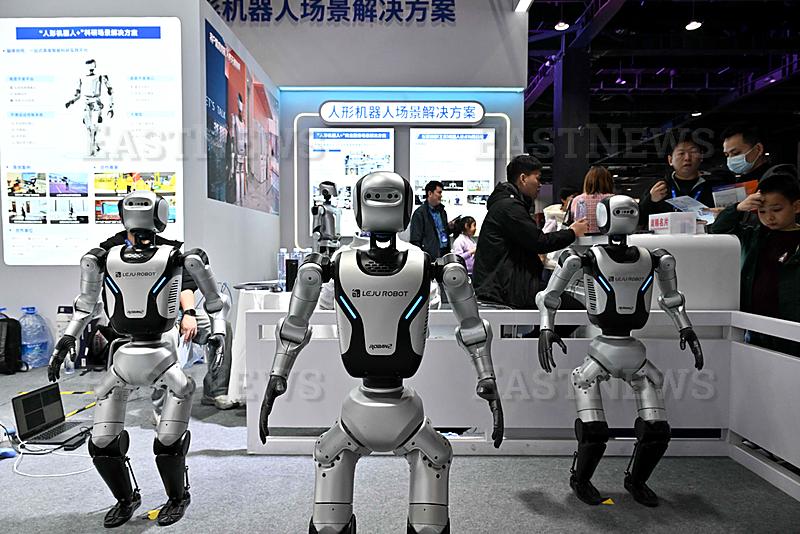 Robots from Leju Robot company are displayed as people visit the Beijing Sci-Fi Carnival in Beijing on March 28, 2026. (Photo by ADEK BERRY / AFP)