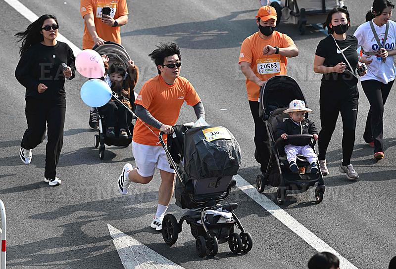 Participants run with strollers during the 2026 Seoul Stroller Run, a family-focused 8km event hosted by the Seoul Metropolitan Government, in central Seoul on March 28, 2026. (Photo by Jung Yeon-je / AFP)