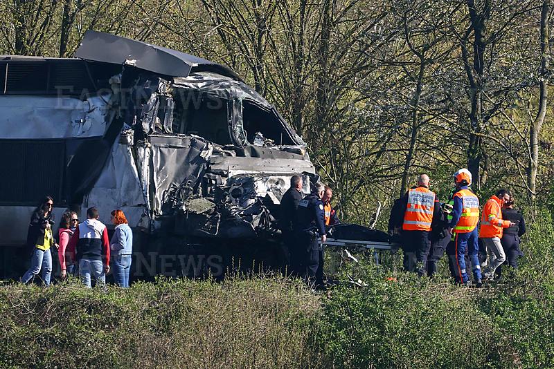 Firefighters and Police officers transport a person from the wreckage of a TGV train after its collision at a level crossing with a lorry between Bethune and Lens, in Bully-les-Mines, in the Pas-de-Calais region, northern France on April 7, 2026. The driver of the TGV train died and 27 people were injured in the accident, AFP has learnt from the prefecture and the SNCF. (Photo by Sameer AL-DOUMY / AFP)