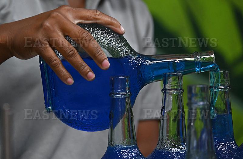 A bartender fill bottles with Curacao liquor at The Curacao Liqueur Distillery in Willemstad, Curacao, in the Dutch Caribbean, on April 9, 2026. The iconic blue color of Curacao liquor is not natural; it is obtained by adding a coloring agent designed to evoke the turquoise waters of the island’s idyllic Caribbean beaches. (Photo by Raul ARBOLEDA / AFP)
