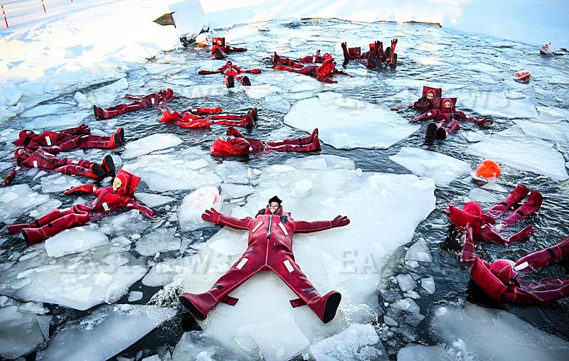 TOPSHOT - Participants wearing isothermal wetsuits float among ice floes in a hole on the frozen Moskva river as they enjoy ice floating - the growing relaxation trend, in Moscow on January 30, 2026. (Photo by Alexander NEMENOV / AFP)