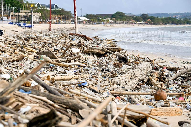 Marine debris and plastic waste washed ashore during the monsoon season covers the beach at Kedonganan near Denpasar on Indonesia`s resort island of Bali on March 10, 2026. (Photo by SONNY TUMBELAKA / AFP)
