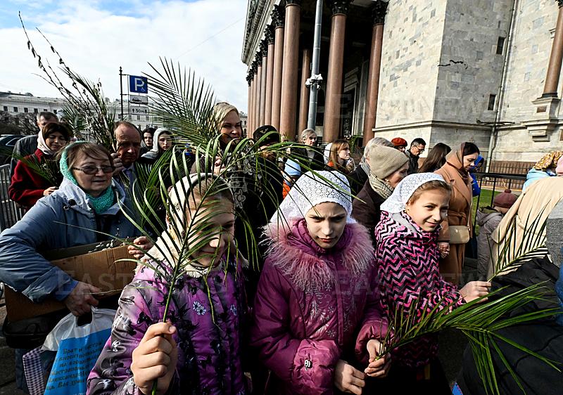 Russian Orthodox faithfuls take part in a procession following the Palm Sunday service at the Saint Isaac`s Cathedral, in Saint Petersburg on April 5, 2026. (Photo by Olga MALTSEVA / AFP)