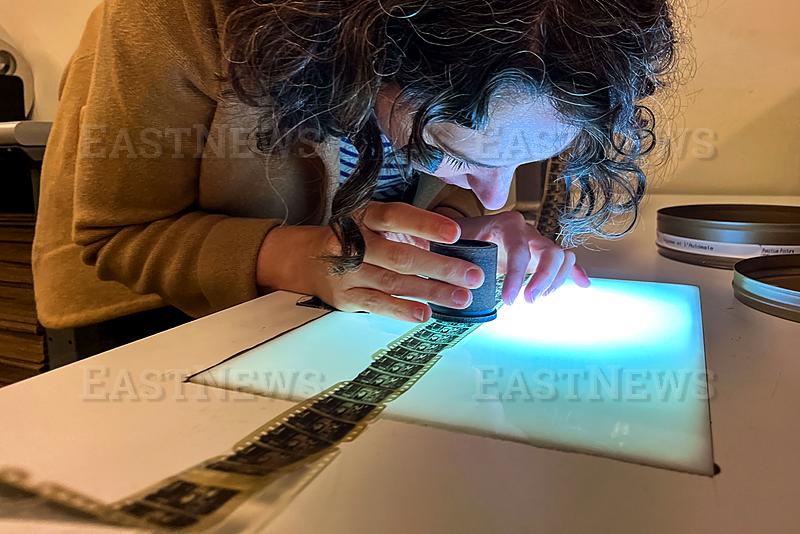 Nitrate Film vault technician Courtney Holschuh using a viewing loupe, views the actual film of Georges Melies’s 1897 French short silent film “Gugusse et l`Automate” in a workspace at the Nitrate Film vault at the Packard Campus of the Library of Congress’s National Audio-Visual Conservation Center in Culpeper, Virginia, on April 2, 2026. Bill McFarland found a lost silent-era film, "Gugusse and the Automaton" made by film pioneer George Melies, in a box of films that had previously been owned by his great-grandfather, William Delisle Frisbee. He then donated those films to the Library of Congress who revealed the find on February 26, 2026. (Photo by Kent Nishimura / AFP)